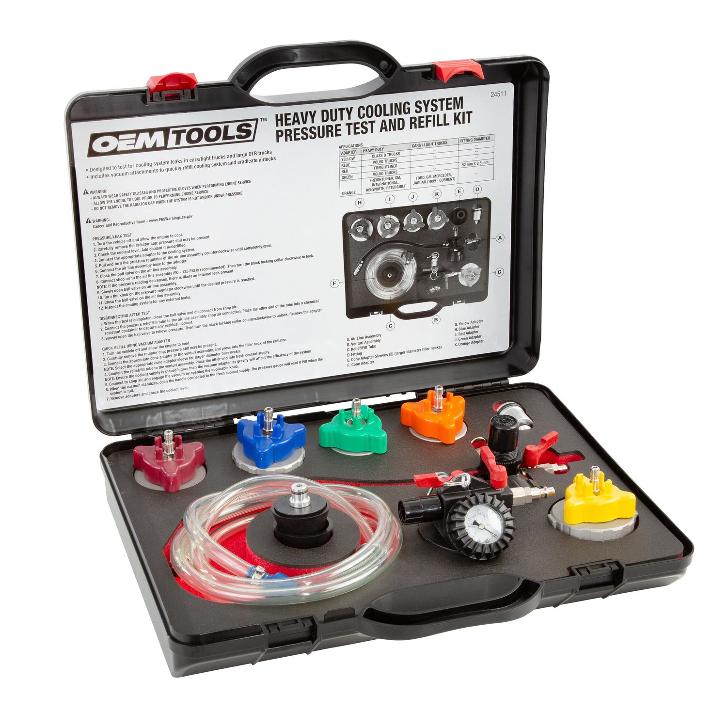 AutoZone stocks the best cooling system test kits for cars and trucks in addition to a wide selection of replacement parts. The average cost for a cooling system pressure test is between 26 and 34. For the rest of the cooling system it says 2 minutes. Cooling System Pressure Test Set SKU 391374 14999 27065 2 32 mm 95 mm and 15 mm Depth Radiator Adapters are Included to Fit a Variety of Radiators on the Market Cap Adapter for These Systems is Also Included System Works with Most Other Tester Systems Pump is. Parts are just part of what we do. PowerBuilt Cooling System Pressure Testing Kit 22 Piece. Also how much is a coolant pressure test. If your car doesnt have the right valve an adapter can help you out. The gauge from Autozone says the cap should maintain within the range for the pressure rating ie a 16 psi cap should maintain in the 15-17 range during the test for 30 seconds.